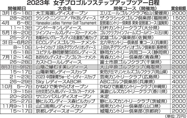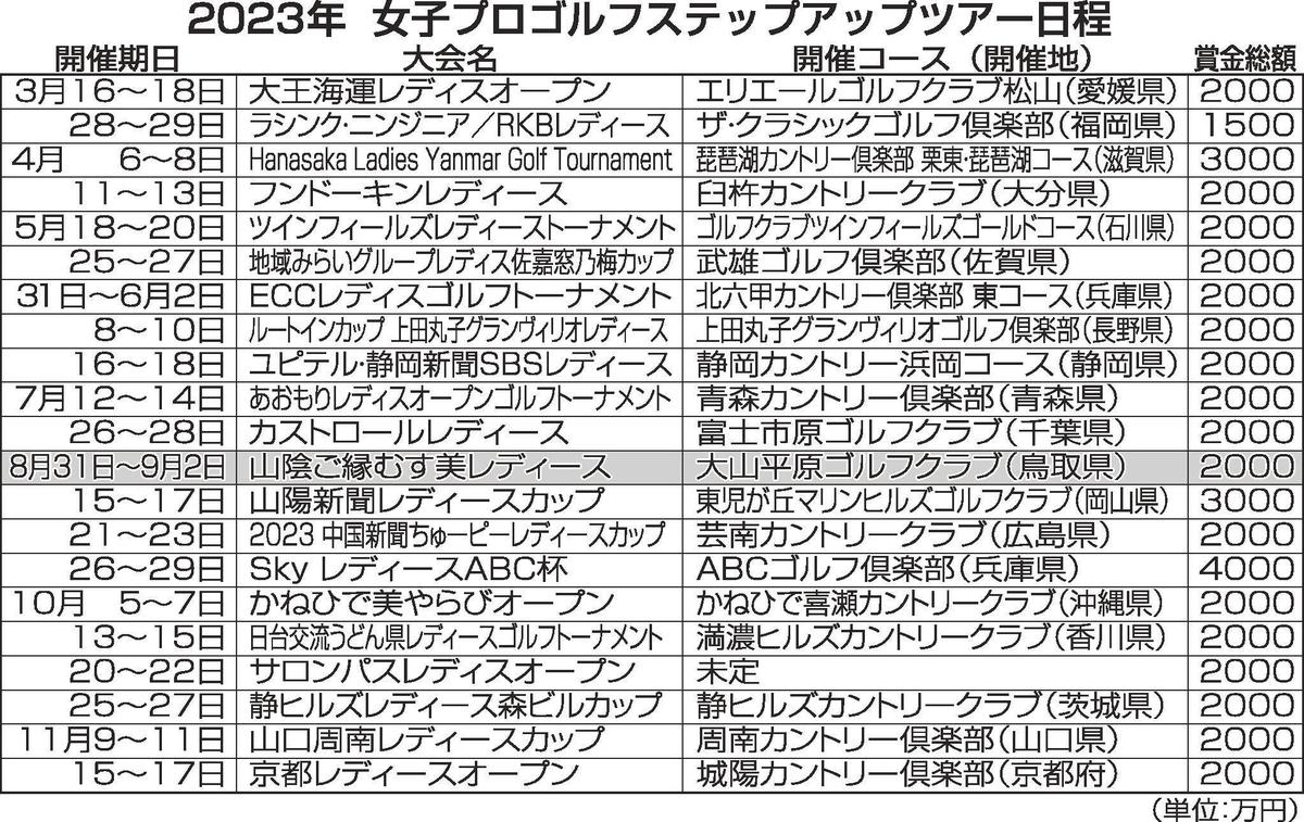 日本女子プロゴルフ協会は20日、来季のステップアップツアーの日程を発表した。今季から4試合増の21試合となり、賞金総額は8千万円増の4億5500万円。第12戦となる山陰ご縁むす美レディースは8月31日から3日間、鳥取県伯耆町丸山の大山平原ゴルフクラブで開かれる。