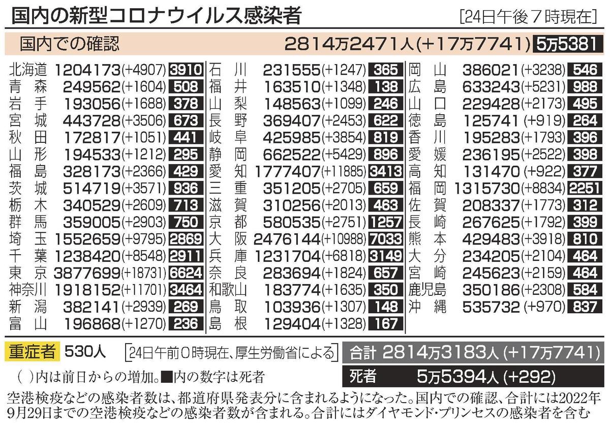 島根県と鳥取県が24日、1328人、1307人が新型コロナウイルスに感染したと発表した。23日確認分。クラスター(感染者集団)は島根で5件、鳥取で2件発生。両県で各1人の感染者が死亡し、累計死者数は島根167人、鳥取148人となった。