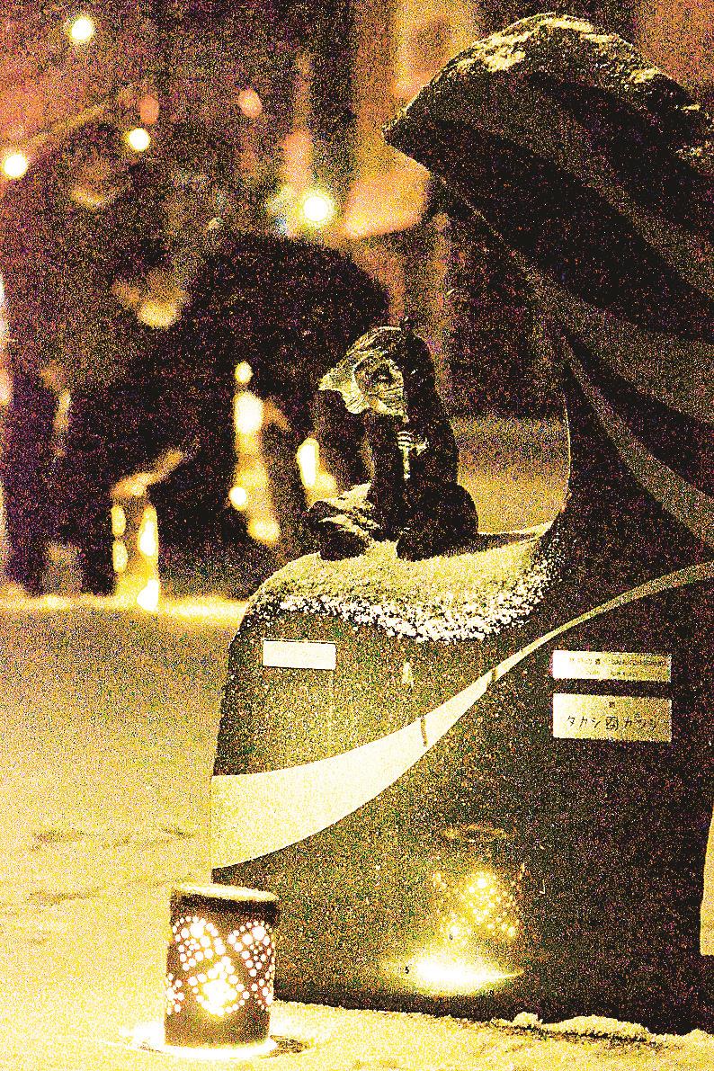 【境港】境港市の観光スポット、水木しげるロードになっている松ケ枝町商店街で23日夜、初の「竹灯ろうまつり」が始まった。約300メートルの区間に並べられた230個の灯籠が妖怪ブロンズ像などを照らし出し、訪れた人たちを楽しませている。25日まで。