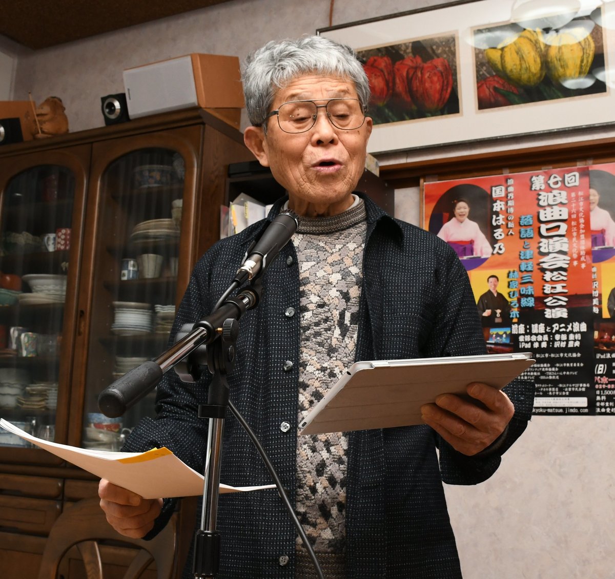 タブレット端末「iPad(アイパッド)」で三味線の音を流して浪曲を楽しむ「iPad浪曲愛好会松江」が、三味線の弾き手がいなくても一人でできる手軽さで、県外にも愛好の輪を広げている。安部重利会長(84)=松江市古志原4丁目=が自らシステムを改良し、生きがいとして情熱を注ぐ浪曲の魅力を伝えている。