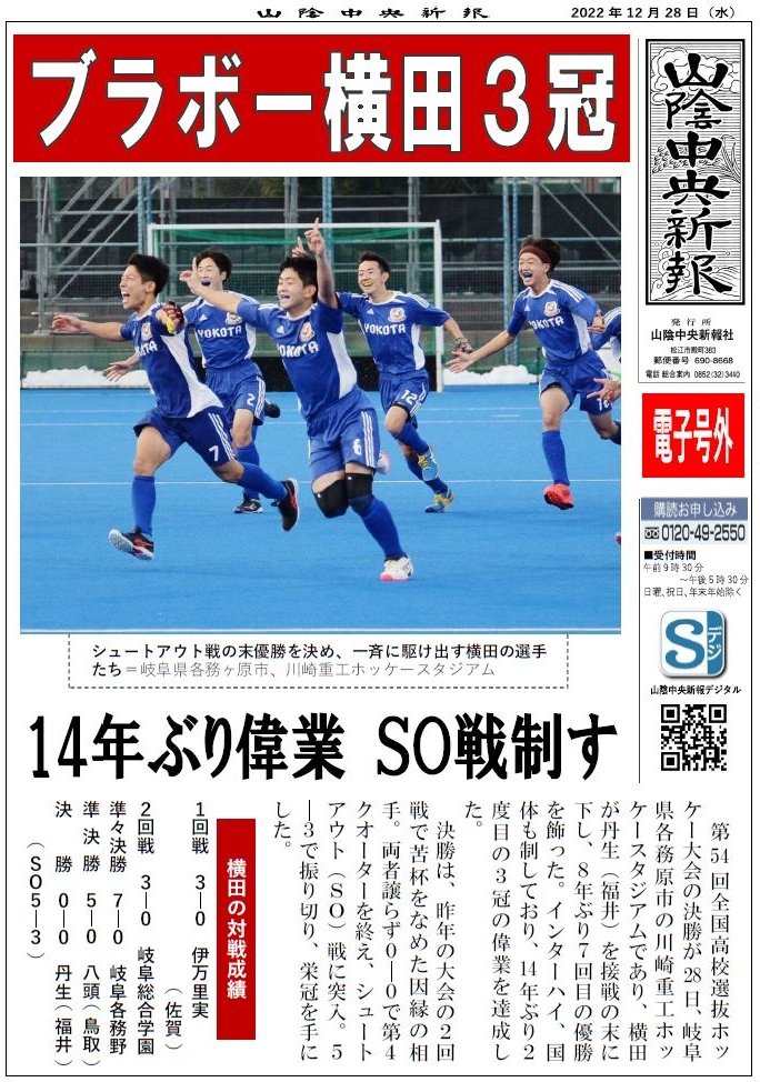 第54回全国高校選抜ホッケー大会最終日は28日、岐阜県各務原市の川崎重工ホッケースタジアムで男女の準決勝と決勝があった。男子の横田はシュートアウト(SO)戦の末、丹生(福井)を破って優勝を果たし、四国総体、栃木国体と合わせて高校3冠を達成した。