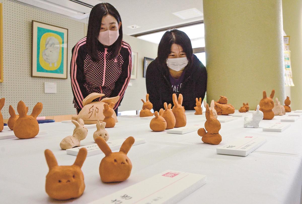島根県西部を中心に関西からも応募があり、愛らしく形作られた粘土や陶器の置物や水彩画といった多様な作品が集まった。浜田市の新田芳道さんは水墨画で体を寄せ合う8匹のウサギを描いた。「自分を磨く意味で、2卯も3卯も欲を出したい」とコメントを添えた。