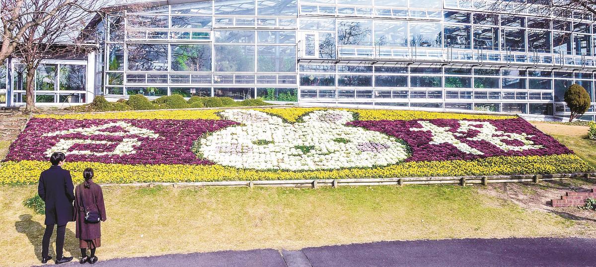 約170平方メートルの花壇に赤、ピンクなど3種類の葉ボタンと黒や黄色のビオラの計6200本を使い飾り付けた。昨年11月上旬に植え付け、順調に成長した。白色の葉ボタンでくっきりと浮かび上がった文字と、もこもことしたウサギのかわいらしい表情が楽しめる。