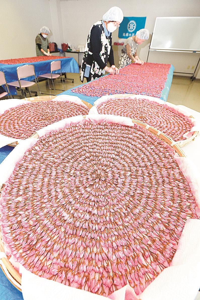 使用するのは市内に咲く八重桜「関山(かんざん)」。4月上旬から中旬にかけて摘んだ花約60キロを、塩と梅酢で約2週間漬けた。同市木次町里方の作業場では10日に陰干しを開始。12日は10人ほどの会員が花の形を整えて、ざるやシートの上に並べた。