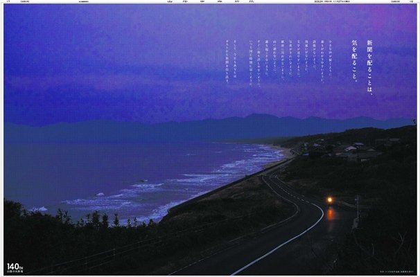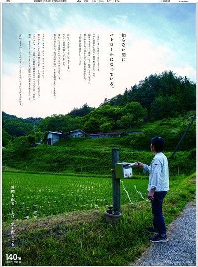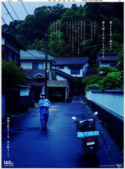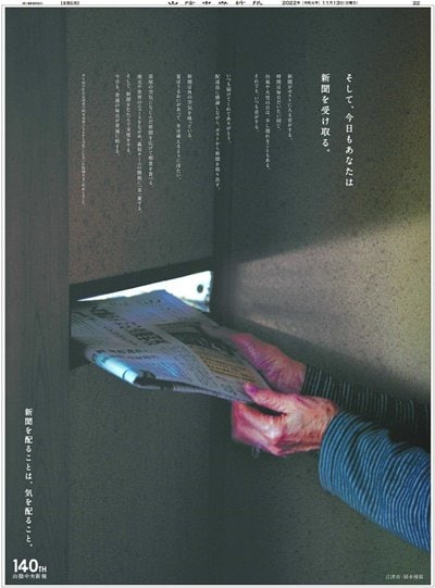 「新聞を配ることは、気を配ること。」 JAA広告賞グランプリ 山陰 2023/1/13 18:05 保存 「JAA広告賞・消費者が選んだ広告コンクール」の新聞広告部門でグランプリを受賞した、山陰中央新報社のブランディング広告「新聞を配ることは、気を配ること。」。 ▼新聞を配ることは、気を配ること。 山陰中央新報140周年 テレビCM 画像をクリックするとPDFが開きます。 5月1日付 5月8日付 6月12日付 6月26日付 7月17日付 7月24日付 8月7日付 8月14日付 8月28日付 9月11日付 9月25日付 10月23日付 11月6日付 11月13日付 11月27日付 無料会員に登録すると 付き記事が毎月5本読める 無料会員に登録する ログインする サービス内容を確認する 保存 記事を保存する この機能は有料会員限定です。保存した記事やフォローした特集をマイページでご覧いただけます。 有料会員になる ログイン 関連記事 益田市で男性襲ったクマ見つからず 近くの真砂小、全校児童送迎で登校 2025/12/5 18:24 恋のキューピッドは高校生? 平田高生が婚活イベント企画 2025/12/5 18:00 スサマジ、前半戦のヤマ場へ 注目の西地区上位対決 けが人復帰で戦力アップ<ゲーム分析> 2025/12/5 17:00 どうなる大山スキー場 復活へ覚悟見せる大山町 課題解決の切り札は? 2025/12/5 16:50 おすすめ記事の配信予定(2025年12月6~12日) 2025/12/5 16:30 特集・連載 韓国、領土・主権展示館の新エリアに抗議 「閉鎖要求」声明 2025/11/15 04:00 健康経営に助言 益田 2025/5/22 04:00 島根、鳥取の上水道料金 値上げ加速か 高騰回避への道標 2025/5/4 17:00 子どもも投票してみよう 松江市長選で島根大生が準備 2025/4/17 04:00 収穫がつながりをつくる 安来市高齢者クラブ 高木浩さん 地元で育つミライのチカラ 島根県立益田翔陽高校 「元気かな?」で地域をつなぐ 浜田市弥栄町 大谷十三一さん 地域住民の懸け橋になった「西田にじいろ食堂」 運営スタッフ 出雲市万田町 小林春美さん