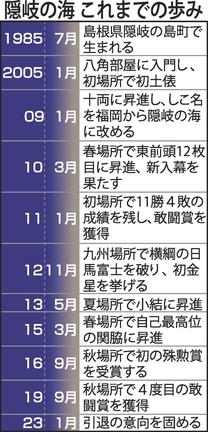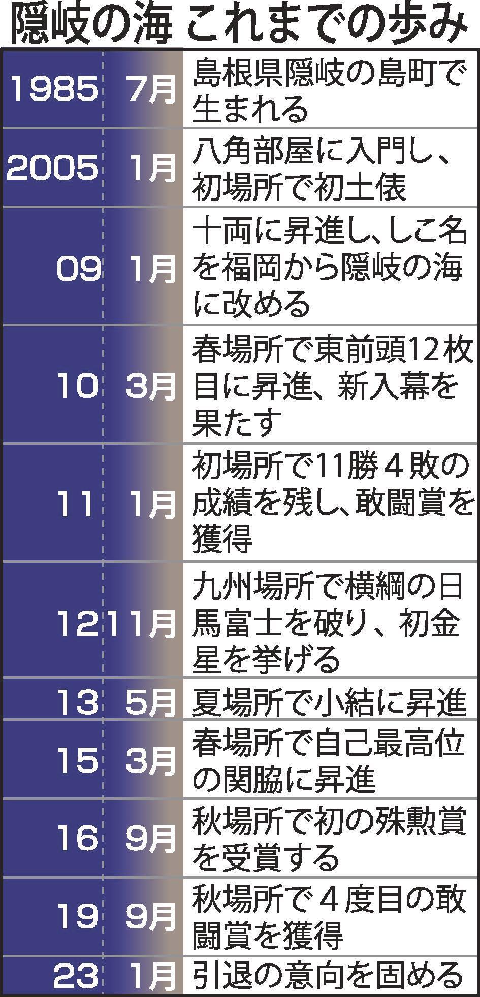 大相撲元関脇で西前頭12枚目の隠岐の海(37)=本名・福岡歩、島根県隠岐の島町出身、八角部屋=が現役引退の意向を固めたことが13日、関係者への取材で分かった。島根県出身力士として121年ぶりに関脇昇進を果たしたベテラン力士が土俵人生の幕を閉じる。 (景山達登、鎌田剛)