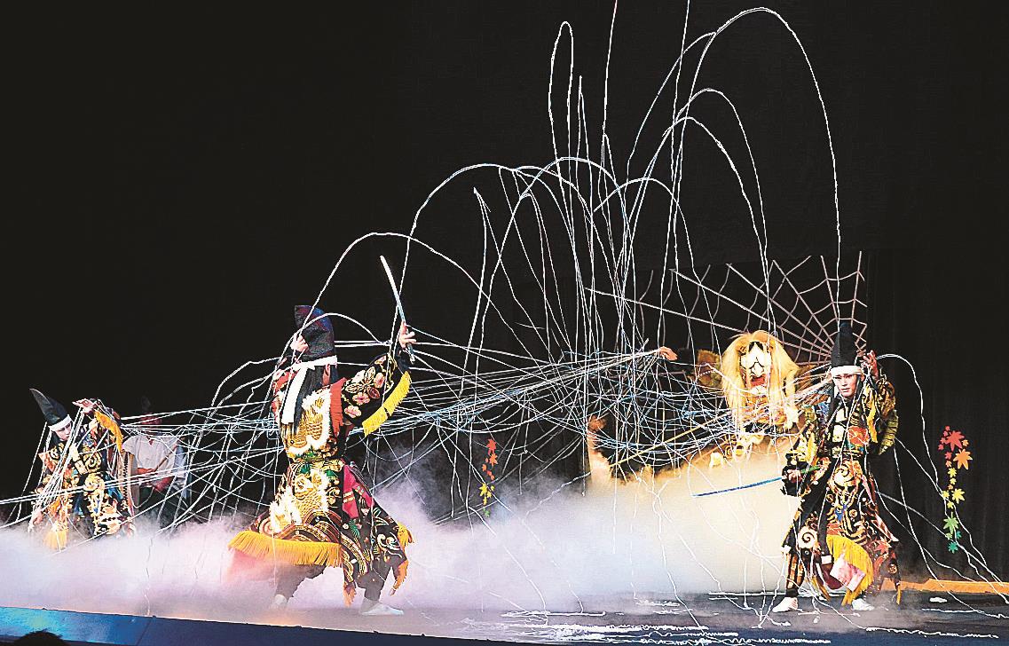 大都神楽団は「紅葉狩(もみじがり)」を演じ、平維茂(たいらのこれもち)と鬼女の激しい戦いの場面や面の早変わりで沸かせた。琴庄神楽団の「土蜘蛛(つちぐも)」では、舞台両脇の花道からクモの糸を模した紙テープが幾筋も飛び、歓声が起こった。
