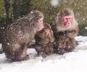 猿が島では昨年誕生した子ザル7匹を含む52匹を飼育する。40センチ近い雪が積もったこの日は、吹雪の中、ふかふかの冬毛に覆われたサル同士が体を寄せ合ったり、3~6匹が集まって暖を取ったりして、寒さに耐えていた。写真で紹介する。