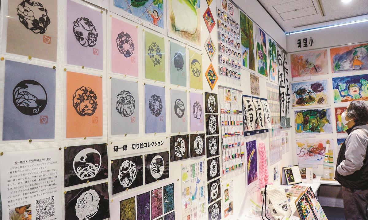 特に目を引くのが荒島小児童の作品。アサガオ、ユリ、モミジなど季節の風物の切り絵は細かい部分まで丁寧に作ってある。はがきの半分程度の紙に、切り絵や消しゴムはんこで季節の風物を描いた「切り絵と消しゴムハンコのはがき」も、かわいらしい。