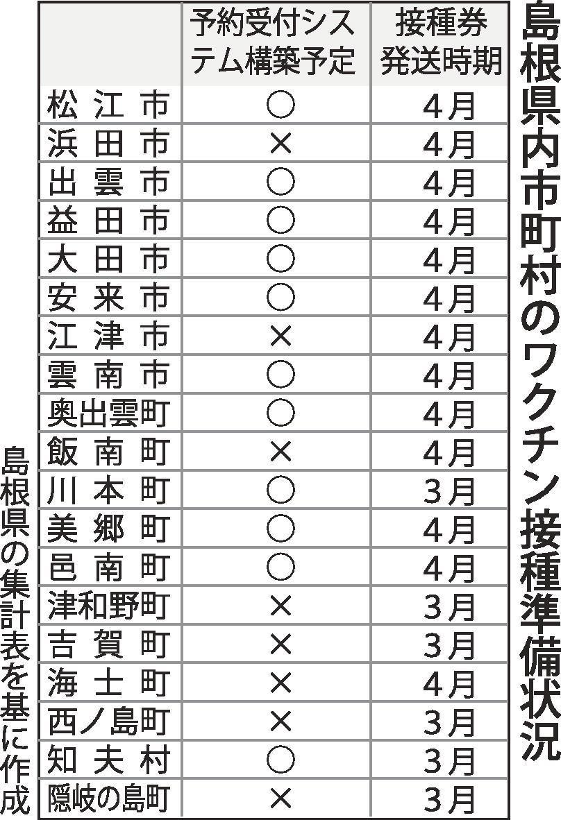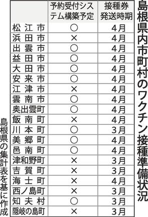 新型コロナウイルスワクチンの接種体制について、島根県が県内19市町村の準備状況をまとめ、17日、明らかにした。松江など11市町村が接種予約の受け付けシステムを構築する予定。高齢者向けに接種券を発送する時期は川本など6町村が3月中、松江など13市町が4月中を見込む。