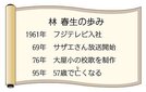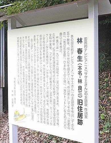 昨年夏には、大屋まちづくり推進(すいしん)委員会が春生の功績(こうせき)を市内外に発信し、人口約300人で高齢化率(りつ)60%を超(こ)える大屋町の活性化(かっせいか)のよりどころにしようと、町内に看板(かんばん)を設置(せっち)しました。縦(たて)90センチ、横180センチで、フグ田サザエのイラストと春生の活躍が刻(きざ)まれています。