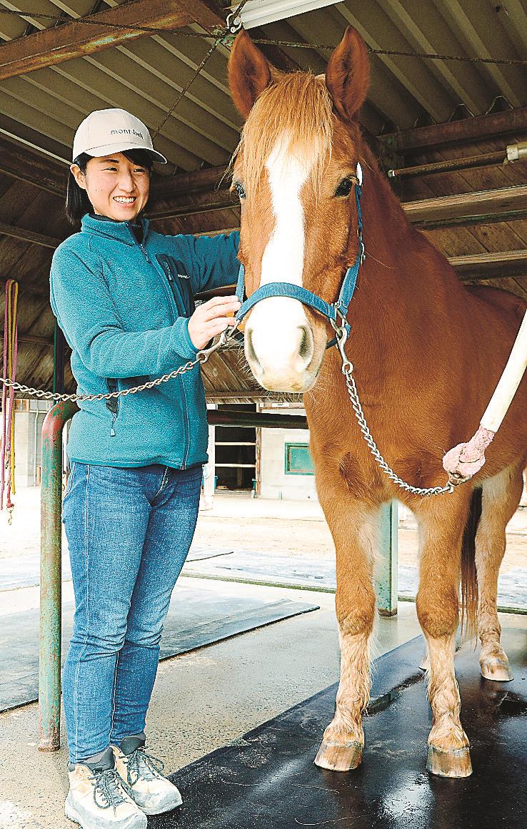 菅野さんは浜田市金城町久佐のかなぎウエスタンライディングパークで勤務する。もともと動物と関わる職業を望み、東京農業大農学部でホースセラピーを学んだ。学内の馬場を訪れる発達障害のある子どもたちが、餌やりや乗馬で目を輝かせ「人同士だと難しいけど、馬が間に入ると一気に変わる」と魅力を知った。
