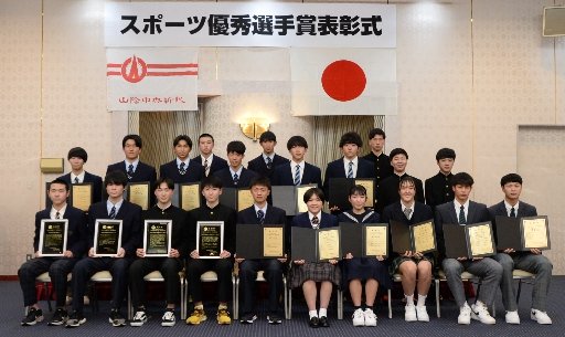 第34回山陰中央新報スポーツ優秀選手賞の表彰式が21日、松江市殿町のサンラポーむらくもであり、2022年に開かれた全国規模の大会で特に優秀な成績を残した島根県内の中学、高校の5団体、12個人(うちペア2組)に表彰状と記念盾が贈られた。