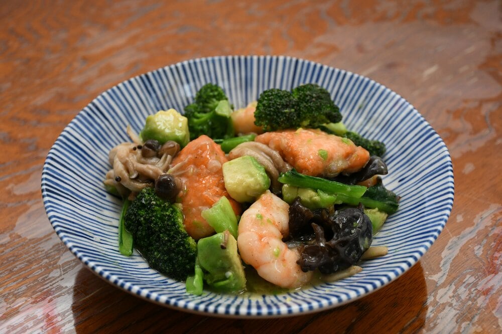 ほかにも人気の「サーモン エビ アボカド ガーリックバター炒め」は、あっさりとした味わいながらコクがあり、うまみがぎゅっと詰まっている。大ぶりのエビやサーモン、アボカドのほかブロッコリー、きくらげ、キノコなども入っていて食べごたえがある。ガーリックバターのいい香りに箸が進んだ。