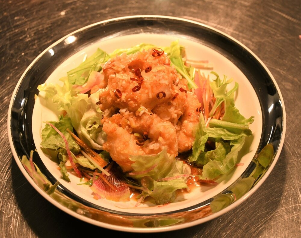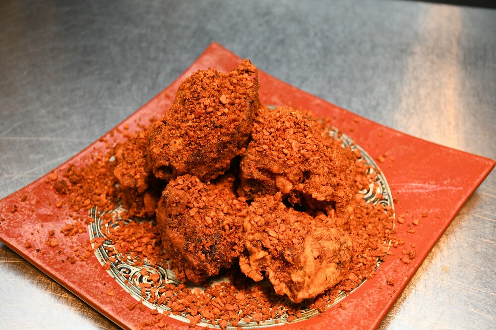 辛み、うまみがつまったスパイスパウダーを振りかけたスペアリブ(1520円)は、辛い物が好きな人にお薦めのメニュー。コショウやトウガラシ、山椒など15種の食材を配合したスパイスを、素揚げした豚肉にふんだんにかけている。スペアリブが隠れるほど真っ赤なスパイスパウダーが振りかけてある様子は迫力がある。一口食べた瞬間、想像以上の辛さが口に広がり驚いたが、辛さだけでなくエビやニンニクのうまみもあり、やみつきになりそう。