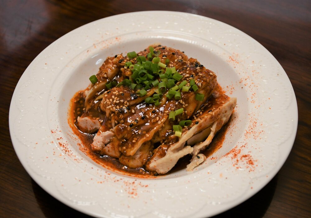 人気メニューは「四川風よだれ鶏」(750円)、「麻婆(マーボー)豆腐」(820円)、「豆苗の塩炒め」(720円)。よだれ鶏は低温でじっくりゆでた鶏もも肉に、自家製ラー油やトウバンジャン、香辛料を配合したタレをかけた一品。マーボー豆腐は自家製トウバンジャンのほか唐辛子や山椒が入り、しびれる辛さがクセになる。