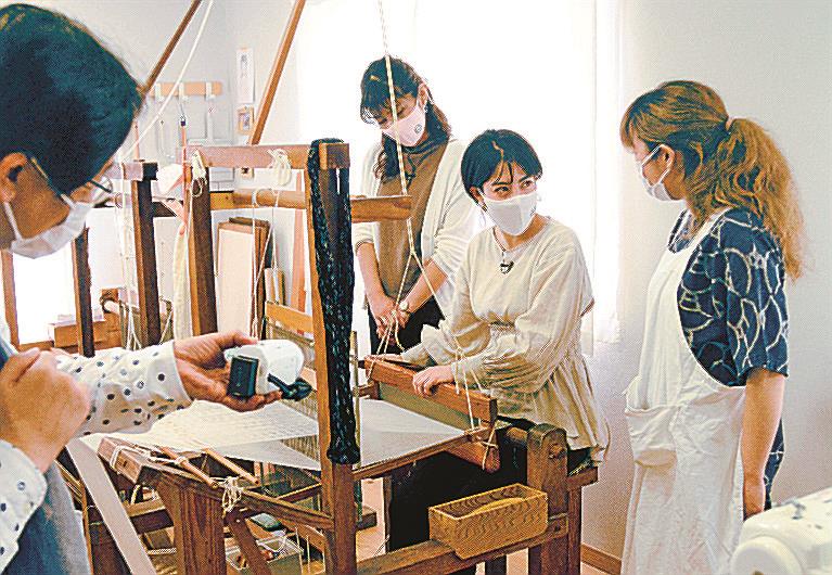 16日は境港市中野町の弓浜絣(ゆみはまがすり)工房Bを訪れ、佛坂香奈子代表の指導で機織りに挑戦。「力加減が難しいけど楽しい」「すてきな模様ですね」と感想を話しながら、弓浜地方に伝わる伝統的工芸品・弓浜絣づくりを体験した。
