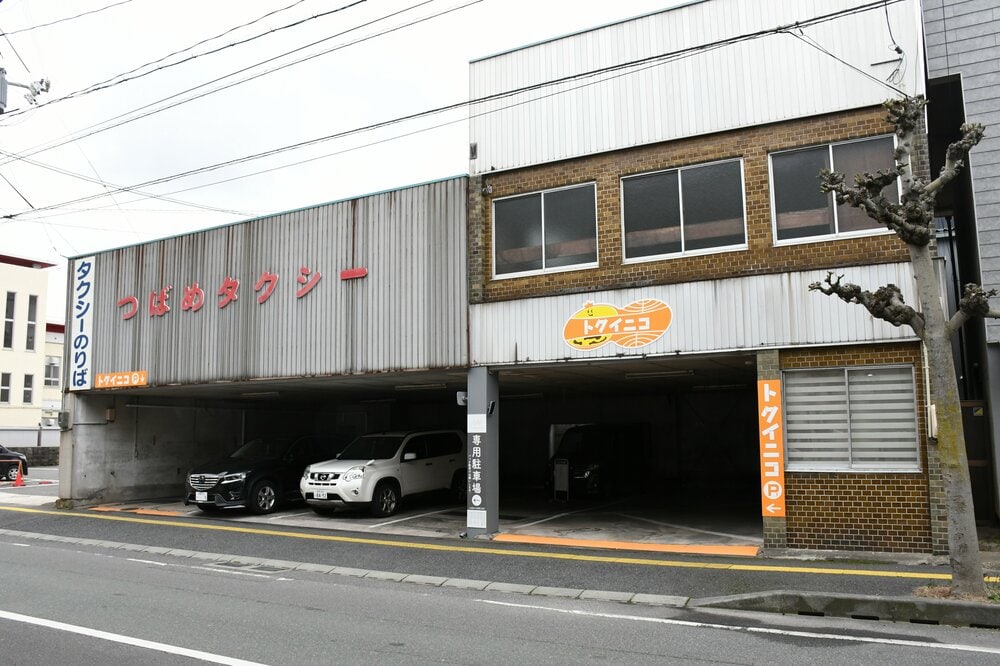 現地を訪れると、タクシー会社共通の車庫と事務所が一体になった建物が目に入った。事務所部分に「トクイニコ」という店名が描かれ、エッグタルトの専門店が入っているようだ。車庫部分の上部にはタクシー会社の「つばめタクシー」という大きな社名の文字が残り、全体を見ると、ちょっと変わったたたずまいだ。