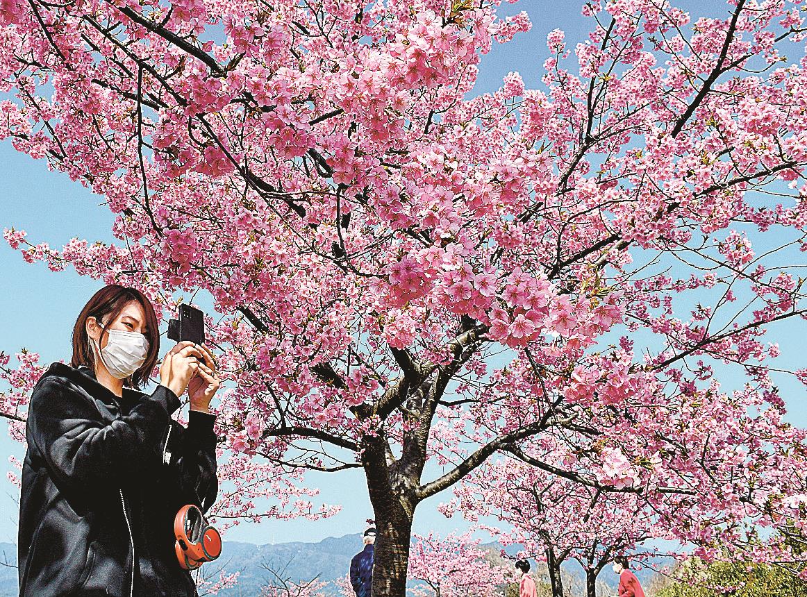 各地で20度を超える暖かさの中、春の野花や樹木の開花が進んだ。松江市八束町二子のサクラの名所・八束千本桜公園では早咲きの河津桜が満開となり、花見客でにぎわった。近くの会社員門脇優さん(38)は「春が来たという感じ。今年は開花が早い」とカメラを向けた。