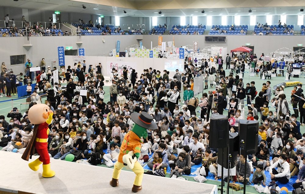 家族で楽しめるイベント「ファミリーフェスティバル」(山陰中央新報社主催)が1日、松江市鹿島町佐陀本郷の鹿島総合体育館であった。大勢の親子連れが詰めかけ、舞台ショーや動物との触れ合いに興じた。2日も午前10時から午後2時半まで開く。