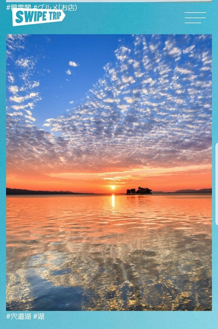 最初に目に留まったのは「宍道湖の夕日」。湖面に夕日と雲が鏡のように映った絶景だ。宍道湖の夕日は「日本夕陽百選」になるほどの有名スポット。言わずと知れた観光地も外しておらず、島根のことをあまり知らない人でもちゃんと代表的な場所を知れるようになっている。