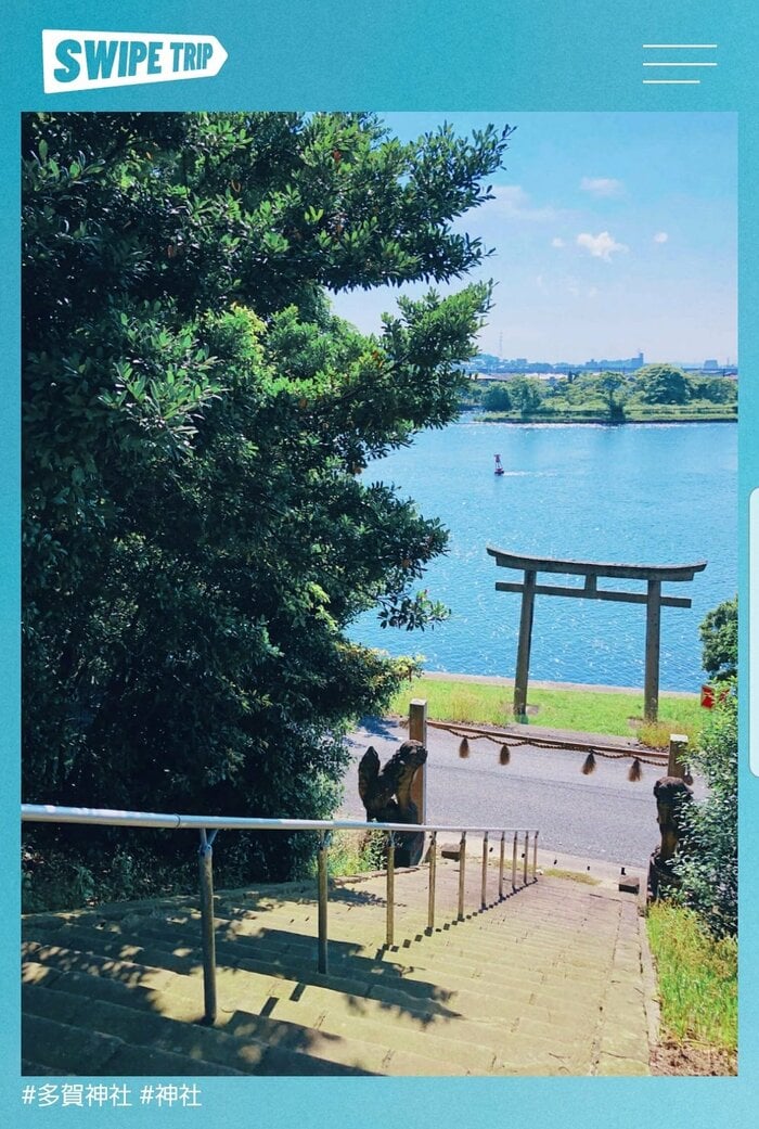 川辺に神社の鳥居が立っている写真も。これは大橋川のすぐそばにある多賀神社(朝酌町)で、スサノオノミコトなどの神様を祭る、出雲国風土記にも記されている神社だ。神在月に全国から集まった神様が、多賀神社に立ち寄ってもてなしを受けるという言い伝えも残る、由緒ある神社でもあり、小高い場所にある境内に上れば川や松江がよく見える。