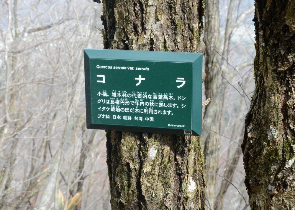 ところどころ、地面に県境を示すとみられる杭があり、近くの木に「境界見出標」と記した札がかかっていた。「ミズナラ」「コナラ」などと木の名前や説明を記した札もあった。「山頂まで500メートル上り」と書いた手作りの木札に元気づけられ、ラストスパート。