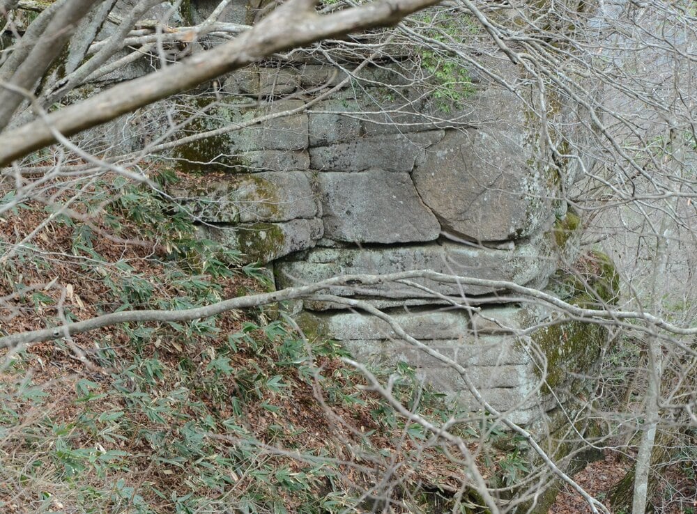 山頂付近で右手のやぶの中に石垣のようなものが見えた。大野さんによると、人工物ではなく自然の石が割れたものだという。石垣のように見えて面白い。