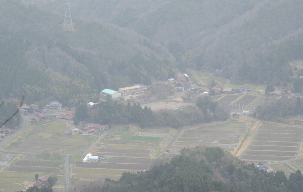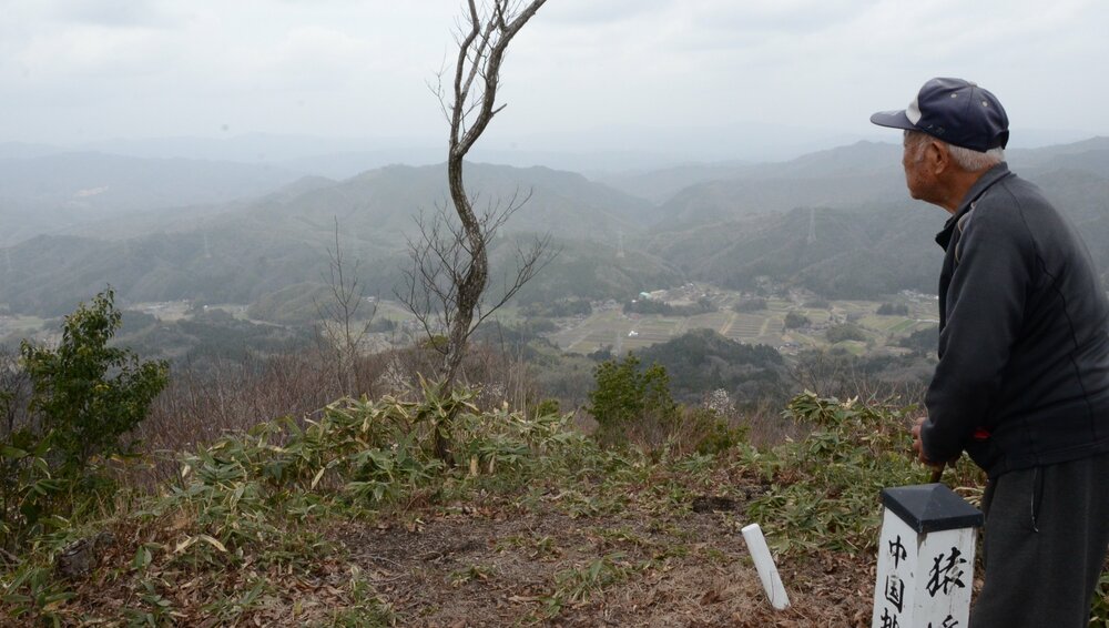 午前11時10分、山頂に到着。島根県側は見晴らしがいい。比田・東比田両地区の集落を見渡せる。「あれが昔の東比田小学校(現在の東比田交流センター)」などと説明してくれた。