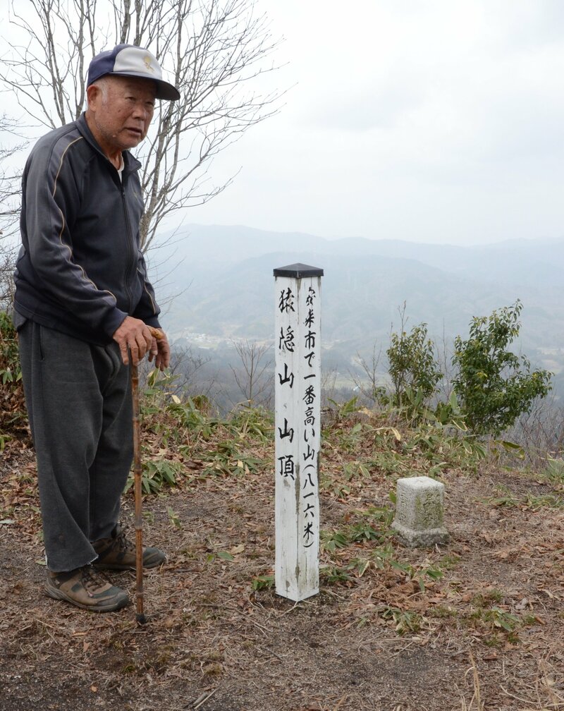 誘ってくれたのは「安来市観光ボランティアガイドの会」の大野善義(よしのり)さん(88)=安来市広瀬町広瀬。東京や大阪で働いた若い頃から登山が好きで、広瀬に帰郷後も写真館経営や旧広瀬町議の仕事の傍ら大山はもちろん、富士山など各地の山に登った。2000年に脳梗塞を患って左半身が不自由になってからも杖を突いて登っているそうだ。猿隠山の魅力は「安来で一番高い山だということ」だという。