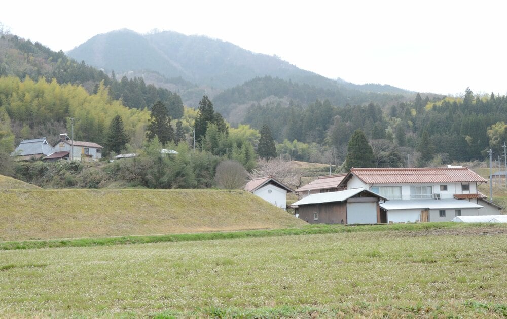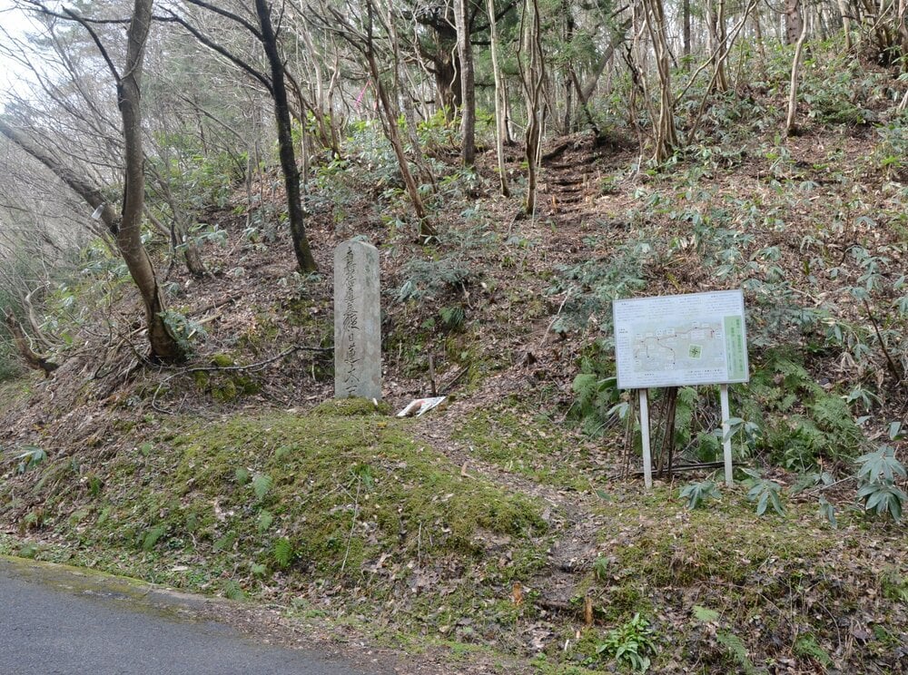 3月27日午前、安来市役所広瀬庁舎で大野さんと合流して東比田に向かい、東比田の田中集落から阿毘縁に抜ける細い道を進んだ。右手の道端に石碑と案内看板が見え、尋ねると、登山口だという。この辺りで標高600メートルくらいらしい。登山道は1・5キロ。