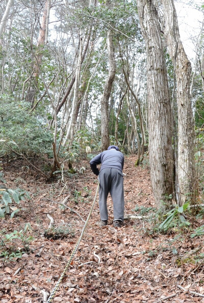 午前9時40分、登山開始。いきなり、ロープをつかんで登る急傾斜の雑木林だ。尾根に出て、なだらかになったかと思うと、今度は急傾斜の下り。助けになるロープを張ってくれた方に感謝。ところどころに赤いテープで目印もある。大野さんも道中、赤いテープをくくりつけていた。
