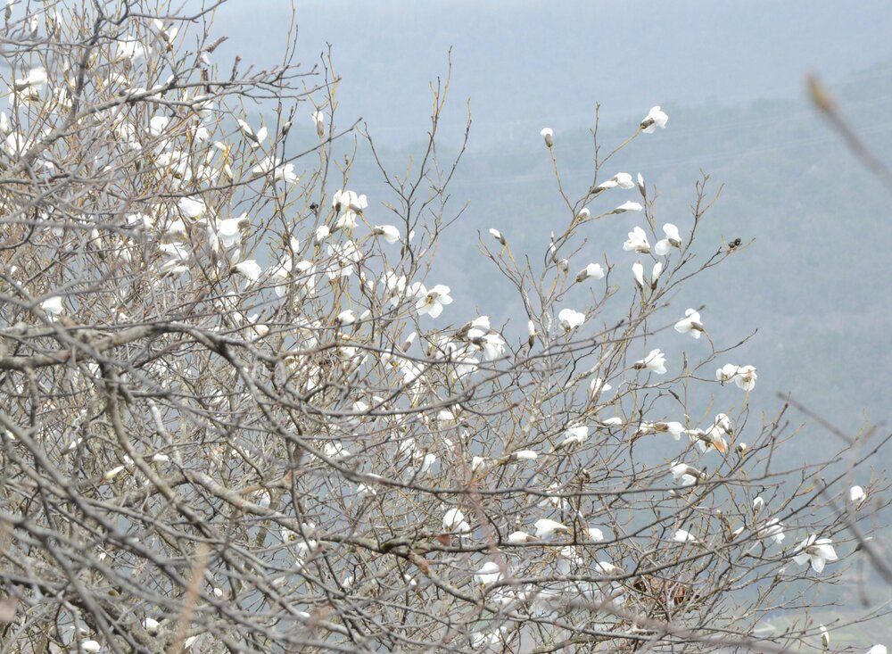 歩きが楽になり、気持ちに余裕ができたせいか、野鳥のさえずりが耳に入る。白い花を咲かせた木も。大野さんに聞くと「コブシ。『北国の春』で、♪コブシ咲く―と歌うでしょう」。