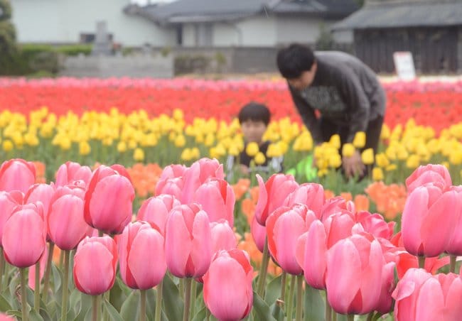 30万本のチューリップが植わる出雲市斐川町今在家の90アールのほ場で、ピンク、黄色、赤、オレンジなど色とりどりの花が咲き誇り、来場者を楽しませている。