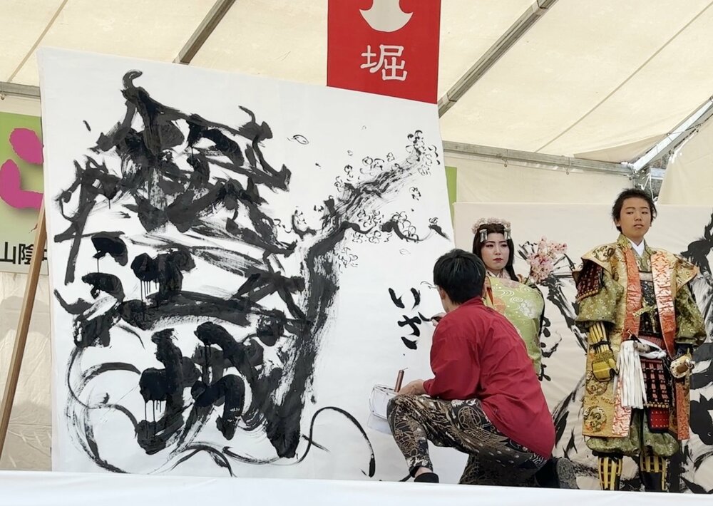 出発式を前に、路上詩人こーたさんとPoriさんが「松江城」を書と絵で表現したアートパフォーマンスを見せた=松江城馬溜