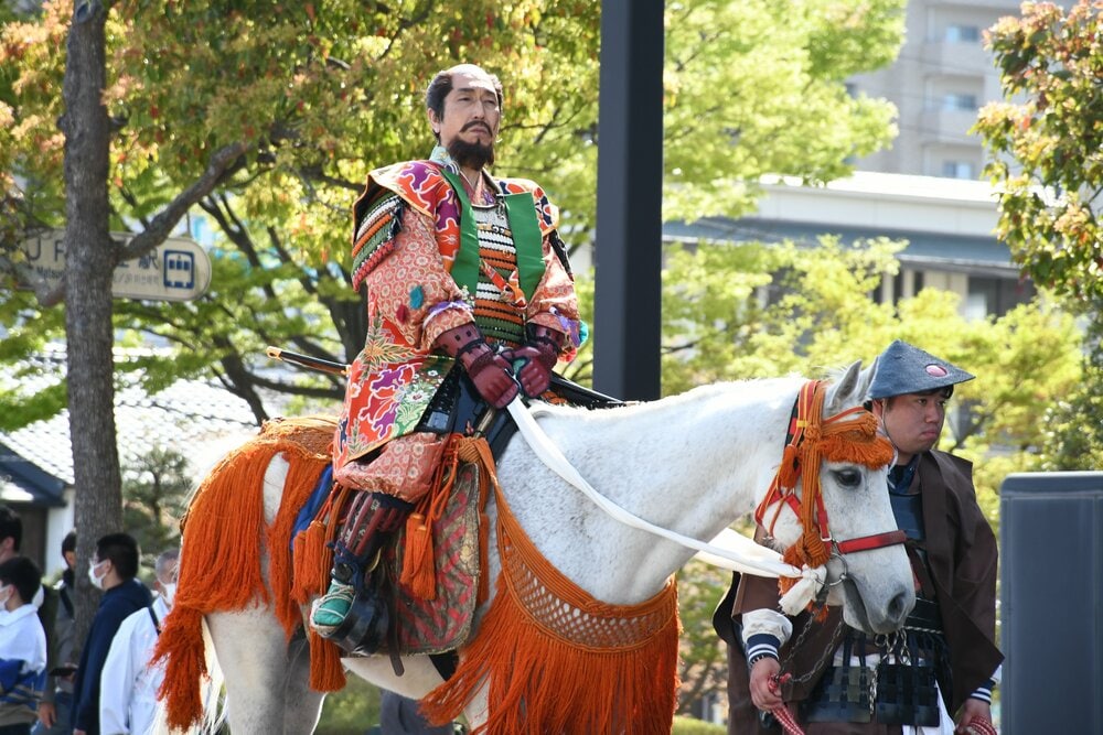 松江開府の祖・堀尾吉晴にふんして練り歩いた、清原学さん=松江市殿町