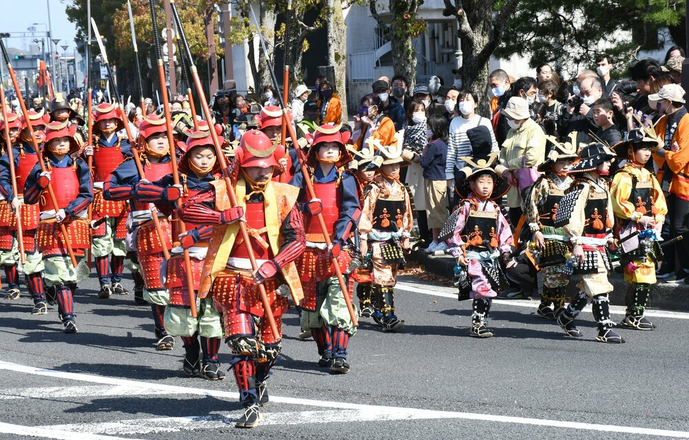 赤備武者隊や子ども武者も練り歩く=松江市殿町