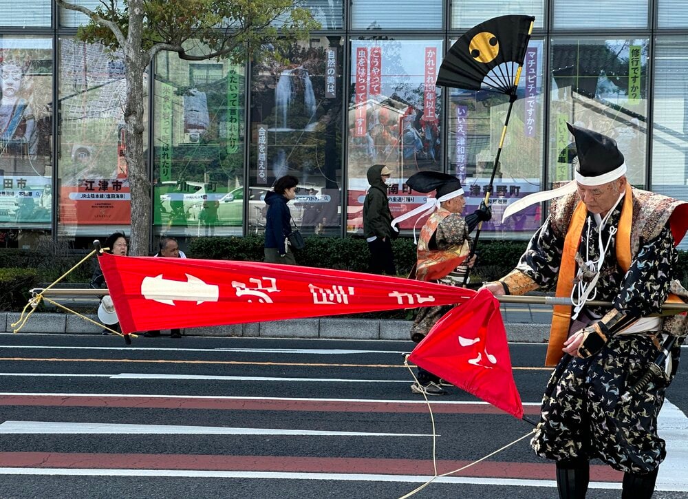 途中強風にあおられ、旗を必死に守る旗持ち武者役=松江市殿町