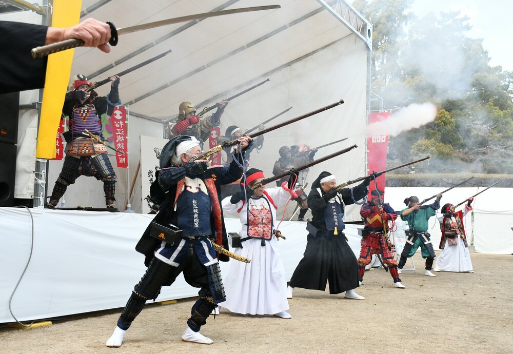 最後は松江城堀尾鉄砲隊による「古式火縄銃演武」が披露され、大きな拍手が鳴り響いた=松江城馬溜