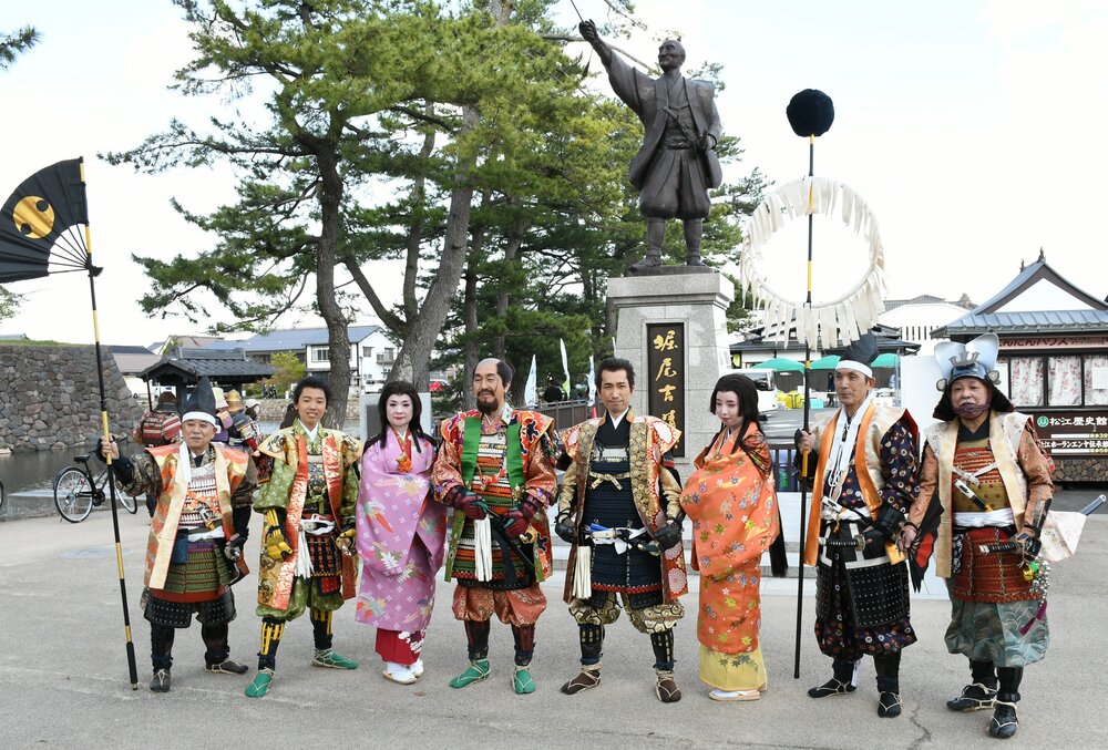 大仕事を終え、堀尾吉晴像の前で記念撮影に収まる第16代堀尾家一行=松江城