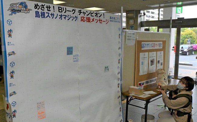 バスケットボール男子Bリーグ1部(B1)の年間王者を決めるチャンピオンシップ(CS)に2季連続出場を決めている島根スサノオマジックの応援メッセージボードが25日、松江市役所ロビーに置かれた。過去最高成績だった昨季の準決勝進出を超えて「今年こそは優勝を」と、市民がペンを執った。5月1日午後4時まで。