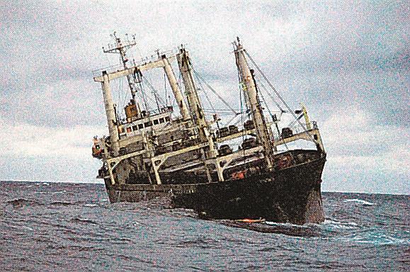 同本部によると、貨物船は右側に大きく傾いて漂流し=写真(第8管区海上保安部提供)=、22日午後2時半ごろ、隠岐の島町から北北東約50キロで沈没した。燃料として重油約40キロリットル、軽油約7キロリットルを積んでおり、沈没した海域に油が浮いているのを確認したが、波や風で消えつつあるという。