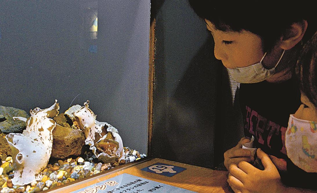 【出雲】珍しい白色のアメフラシが出雲市園町の宍道湖自然館ゴビウスに展示され、来館者の目を引いている。