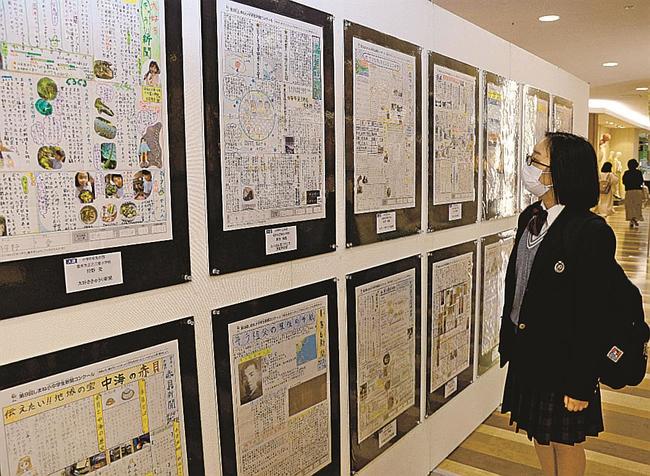 九つの部門ごとに最優秀、優秀、優良の入賞作3点と入選作17点を展示。地元の特産品や自分の好きな物、戦争に行った曽祖父の手紙、職場体験先での経験などをテーマに手書きで新聞をまとめた。
