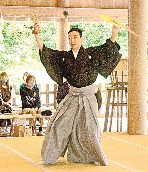 美保神社で2人は、神職からおはらいを受けた後で舞踊を奉納。参拝客らが見守る中、花柳さんは扇子を手に美しい所作で踊り、柚木さんは踊りに加え伸びやかな歌声も披露した。