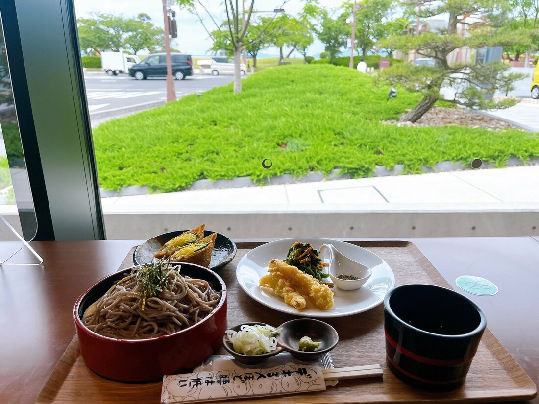 宍道湖側の席を選び、放送会館前の道路をせわしなく通過する車を見ながら待っていること5分。番号が呼ばれ料理を受け取った。割子に入ったそばにはのりがかかっていて、ワサビとネギもついていた。いなり寿司は、外側の油揚げや錦糸卵と中に入っているサバのバランスが良く、いくらでも食べられそうだ。エビ天も、ふわふわの衣にくるまれたエビとスパイスの組み合わせがおいしかった。全体的にどの年代の人からも受け入れられる味付けでしっかりとしたボリュームもあり、お腹は満足した。