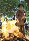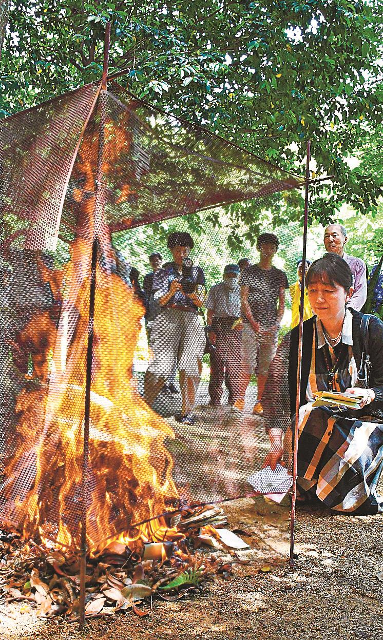 参加者と手紙を直接持ち込んだ来訪者は炎に向かって手紙を一通ずつ投げ入れ、思いが炎や煙に姿を変えて天に昇る様子を、手を合わせて見守った。