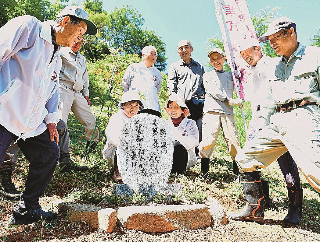 御影石でできた石碑は縦70センチ、横50センチで、人麻呂が妻への愛を表現した万葉集の歌「路の辺の壱師(いちし)の花のいちしろく 人皆知りぬわが恋妻は」を刻んだ。会員が昨年末、歌の中の「壱師の花」とされるヒガンバナの苗を近くに植えており、秋には石碑を囲むように花が咲くという。