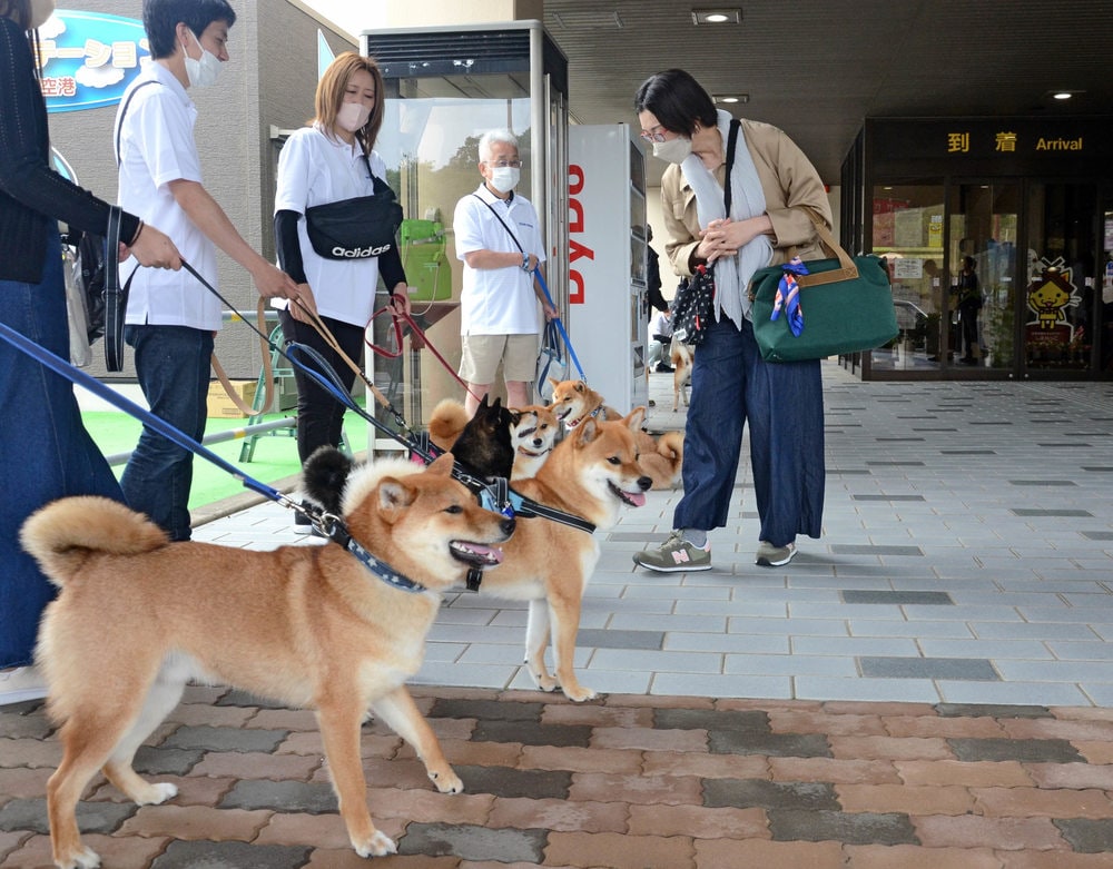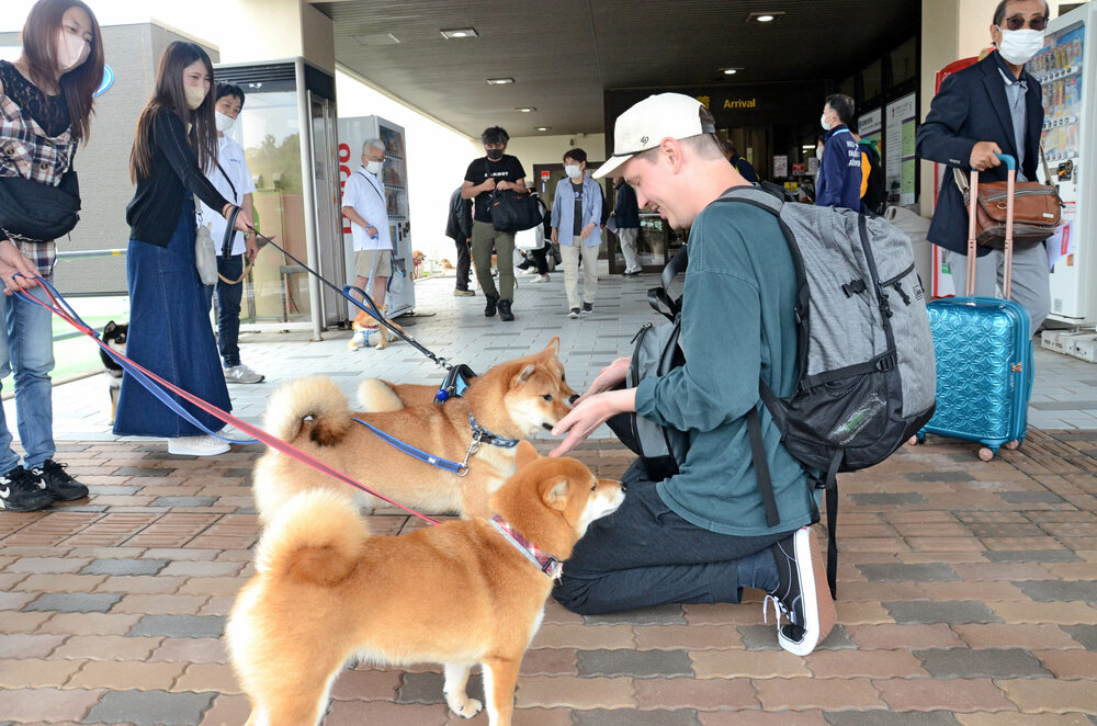 5月下旬、益田市内田町の萩・石見空港では、13匹の柴犬が飛行機から降り立った客を出迎えた。かわいらしい出迎えに喜ぶ利用客は子犬を抱いたり、写真を撮ったりしてふれあいを楽しんでいた。空港ビルの管理運営をする石見空港ターミナルビルが益田柴犬育成会と共催するイベントで、毎月第1、第3土曜日に開いている。