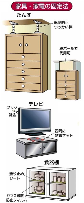 3、〈地震対策〉高い所に物を置かない。置くなら、落ちても壊れたり、ケガしない物を置く。婚礼家具のタンスと本棚は、天井とたんす・本棚の間に突っ張り棒を置きたんす・本棚が倒れないようにする。万が一のために、たんすのすぐそばで寝ない。